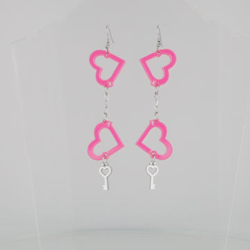 Add a touch of sexiness to your look with our Cuff It Earrings. These neon pink acrylic heart charms are chained together to resemble handcuffs, with a key charm for an added detail. Made with durable stainless steel earwires, they are both stylish and sturdy. You'll love the unique look and feel of these earrings.