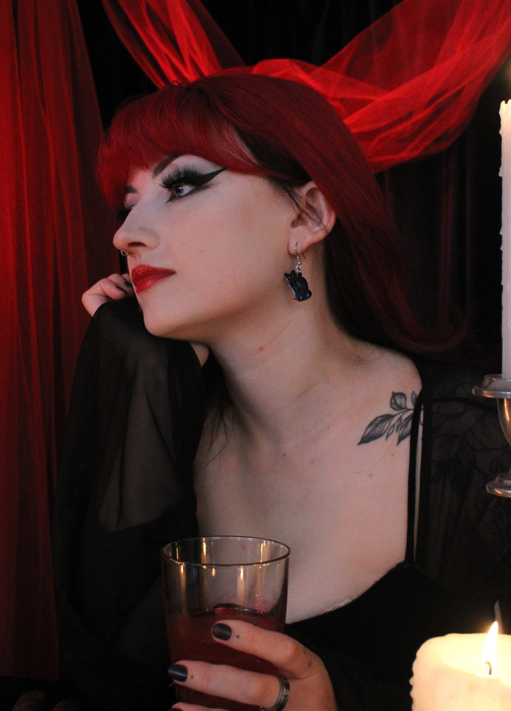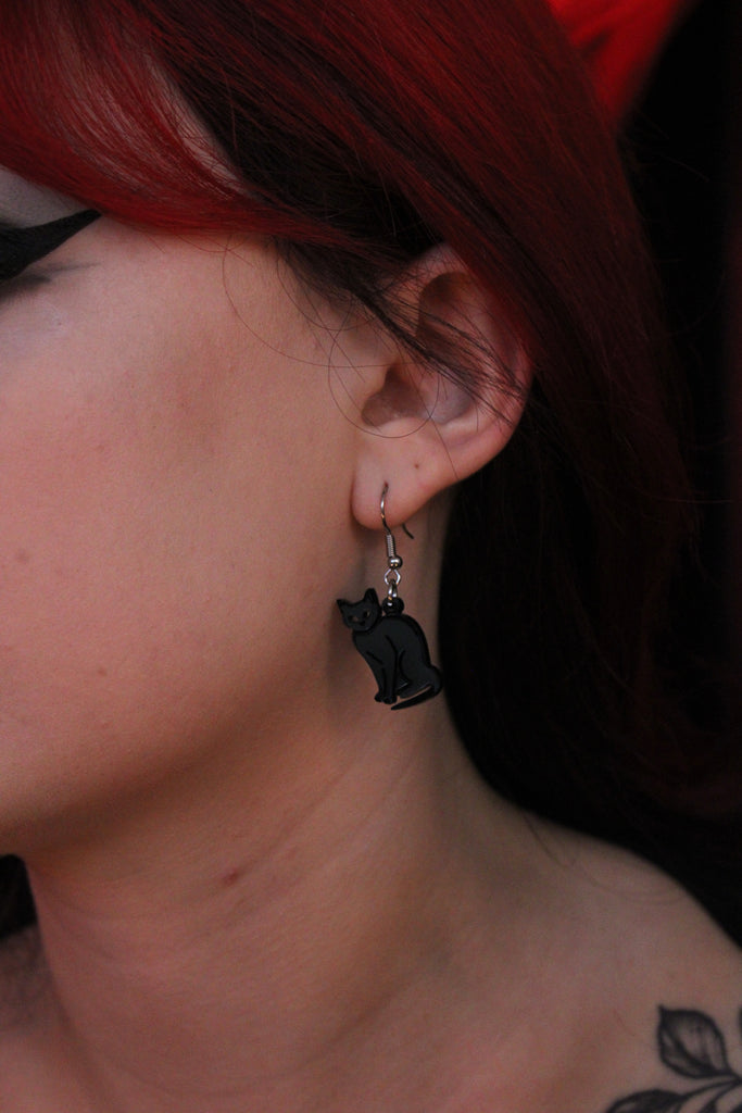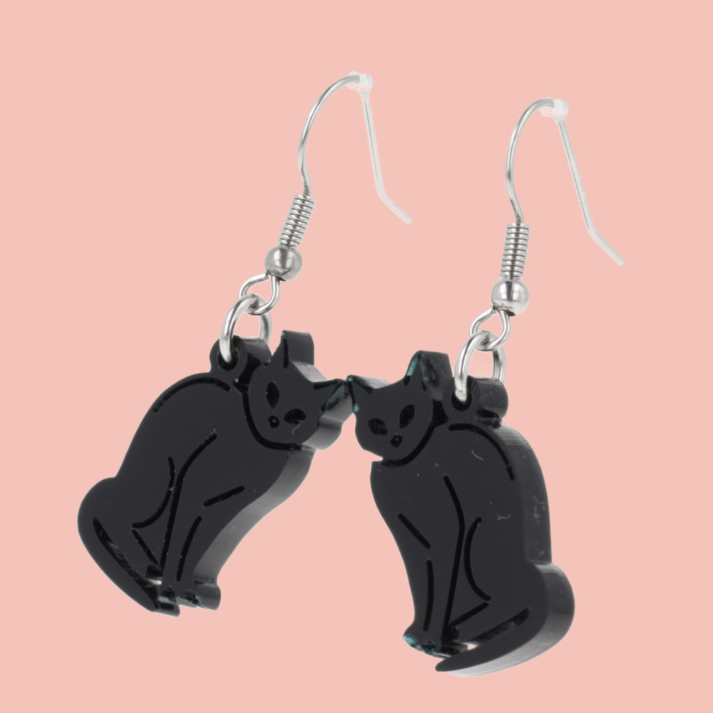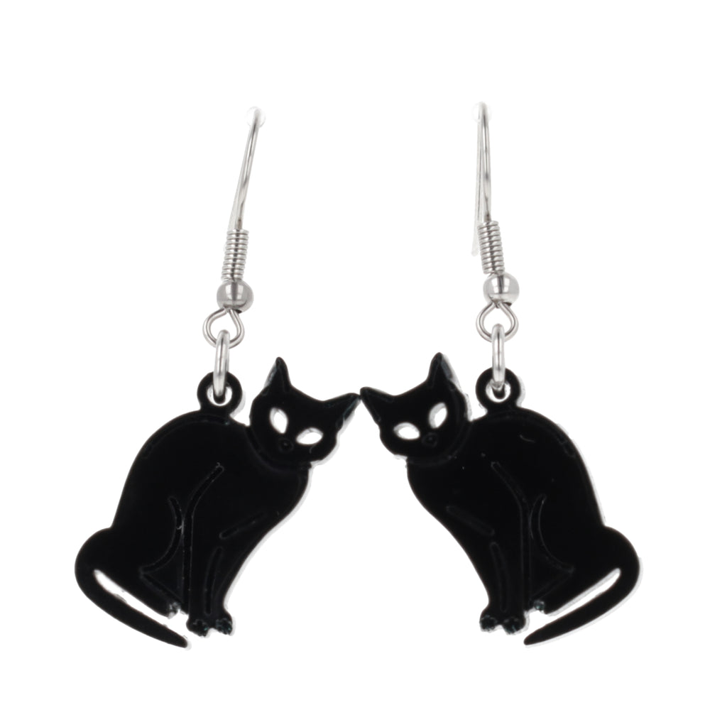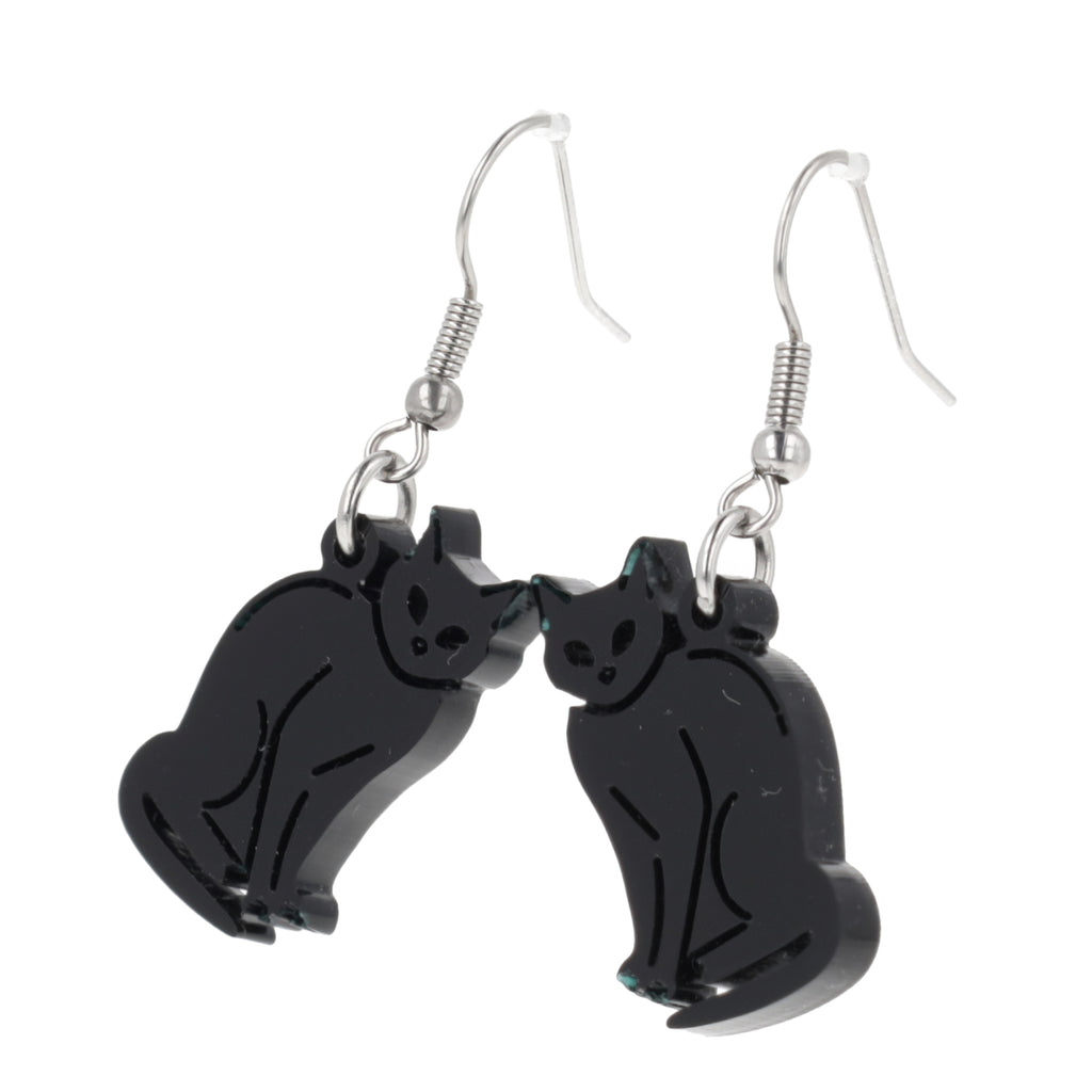 Bring a playful purr-sonality to your outfit with the Greta Black Cat Earrings. Featuring charming black acrylic cat shapes dangling from sturdy stainless steel earwires, these earrings are both lightweight and durable.
