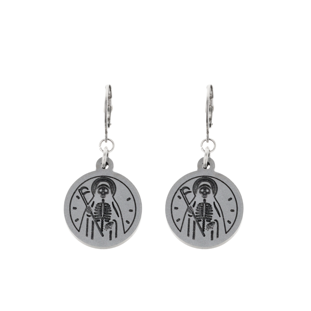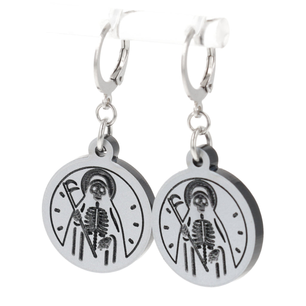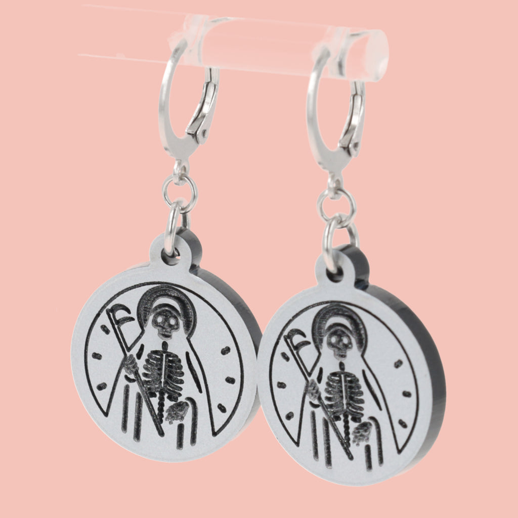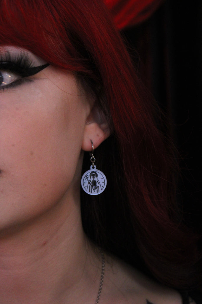 Step into the shadows with the Grim Reaper Huggie Hoop Earrings. These daring accessories feature detailed acrylic discs with the iconic Grim Reaper design, suspended from sleek stainless steel hoops that offer both style and durability. Perfect for those who embrace the bold and the mysterious.