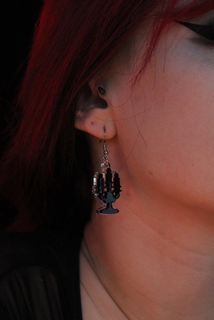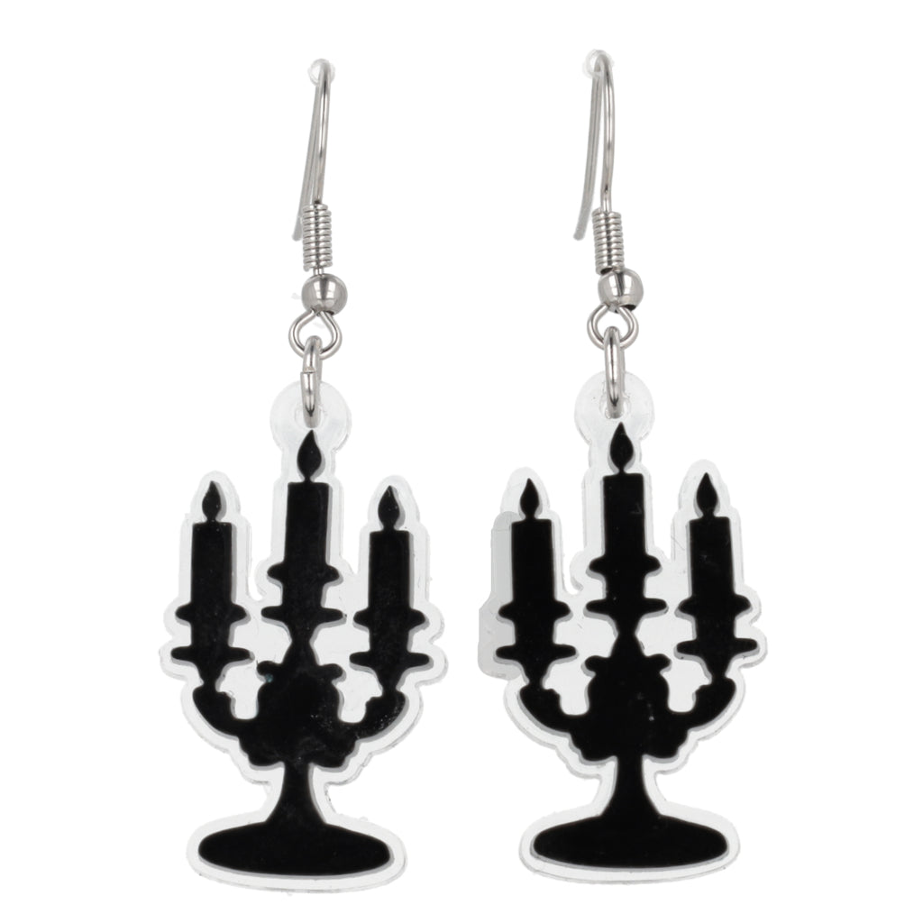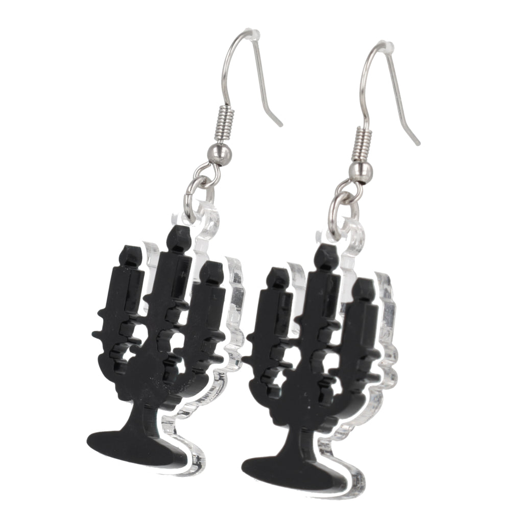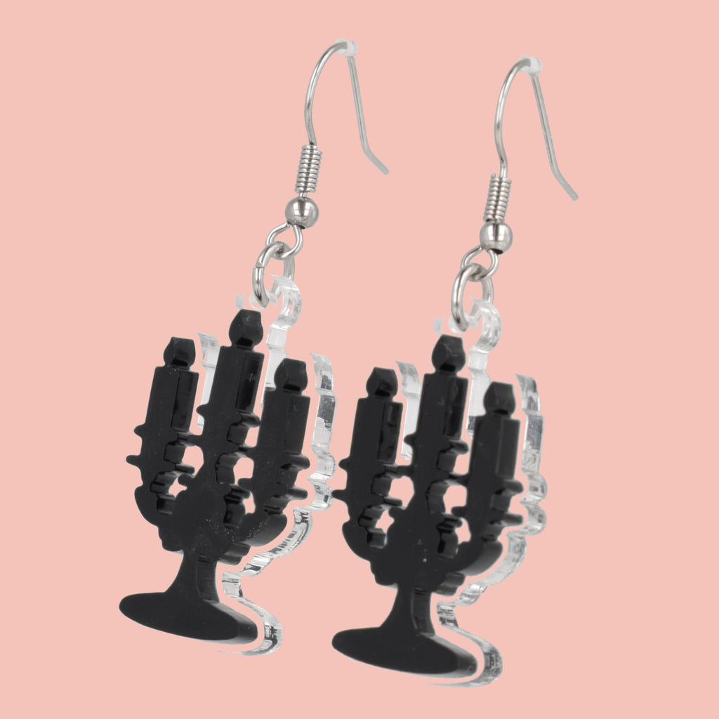 These playful "It's Lit Candelabra Earrings" feature a striking double-layered design with a clear acrylic base and a bold black front layer, creating a fun, modern twist on classic elegance. Lightweight and comfortable, they hang from durable stainless steel earwires, adding a touch of quirky charm to any outfit. Perfect for lighting up your look with style and personality!