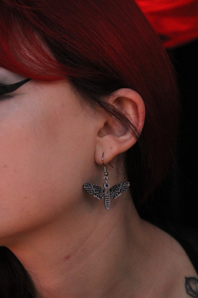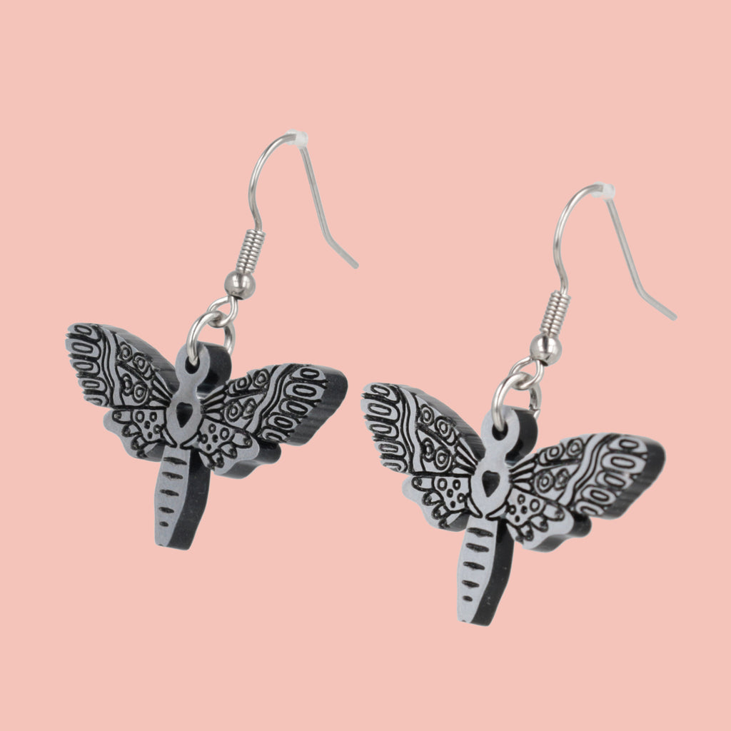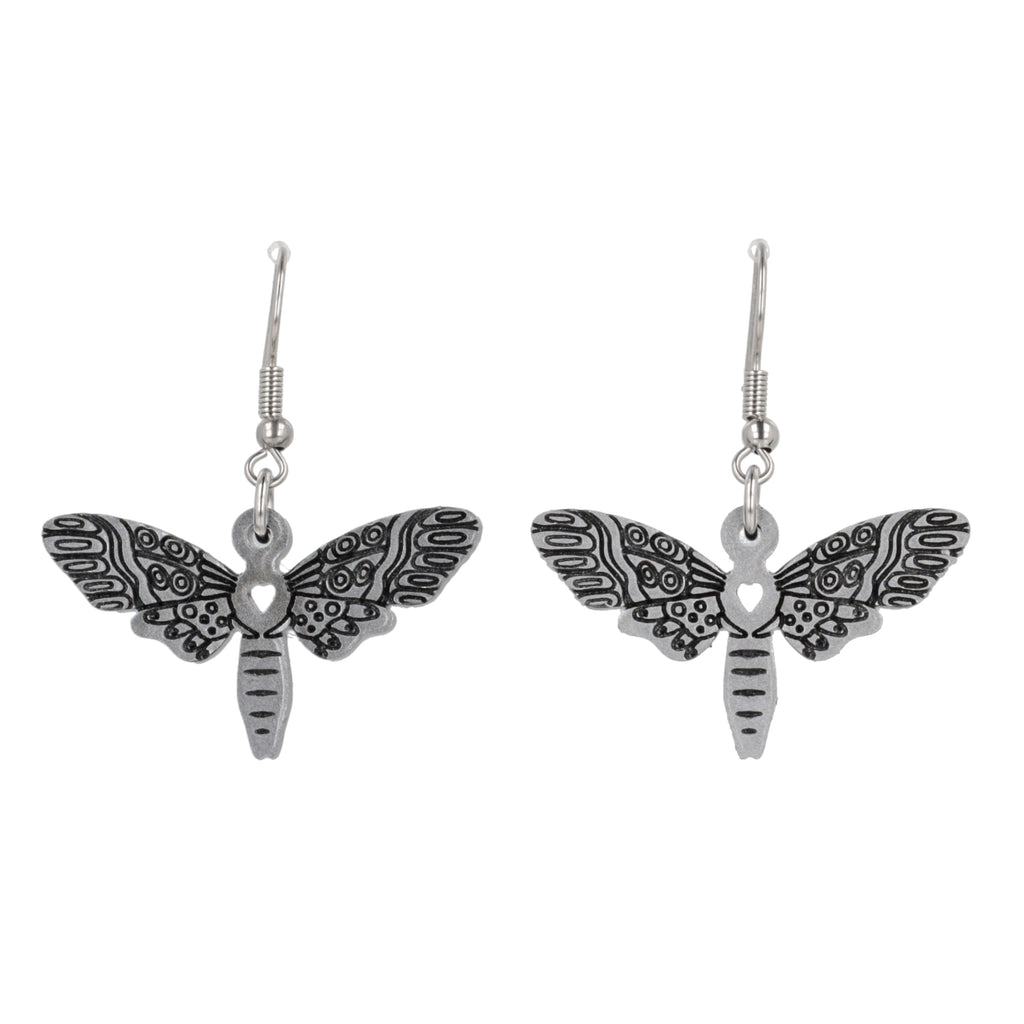 Delight in the charm of these playful Silver Moth Earrings, where ornate silver acrylic moths flutter from sturdy stainless steel earwires. Lightweight and eye-catching, they add a spark of nature-inspired magic to any outfit with a fun, whimsical twist.