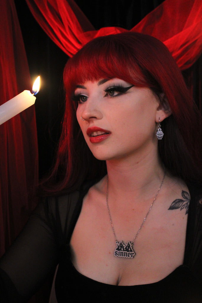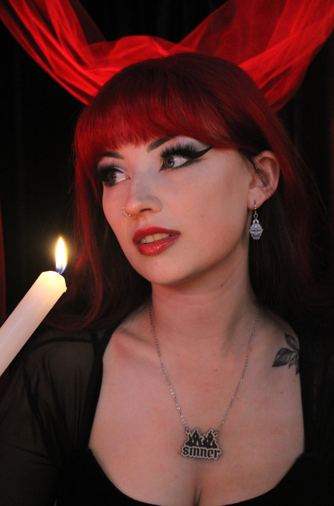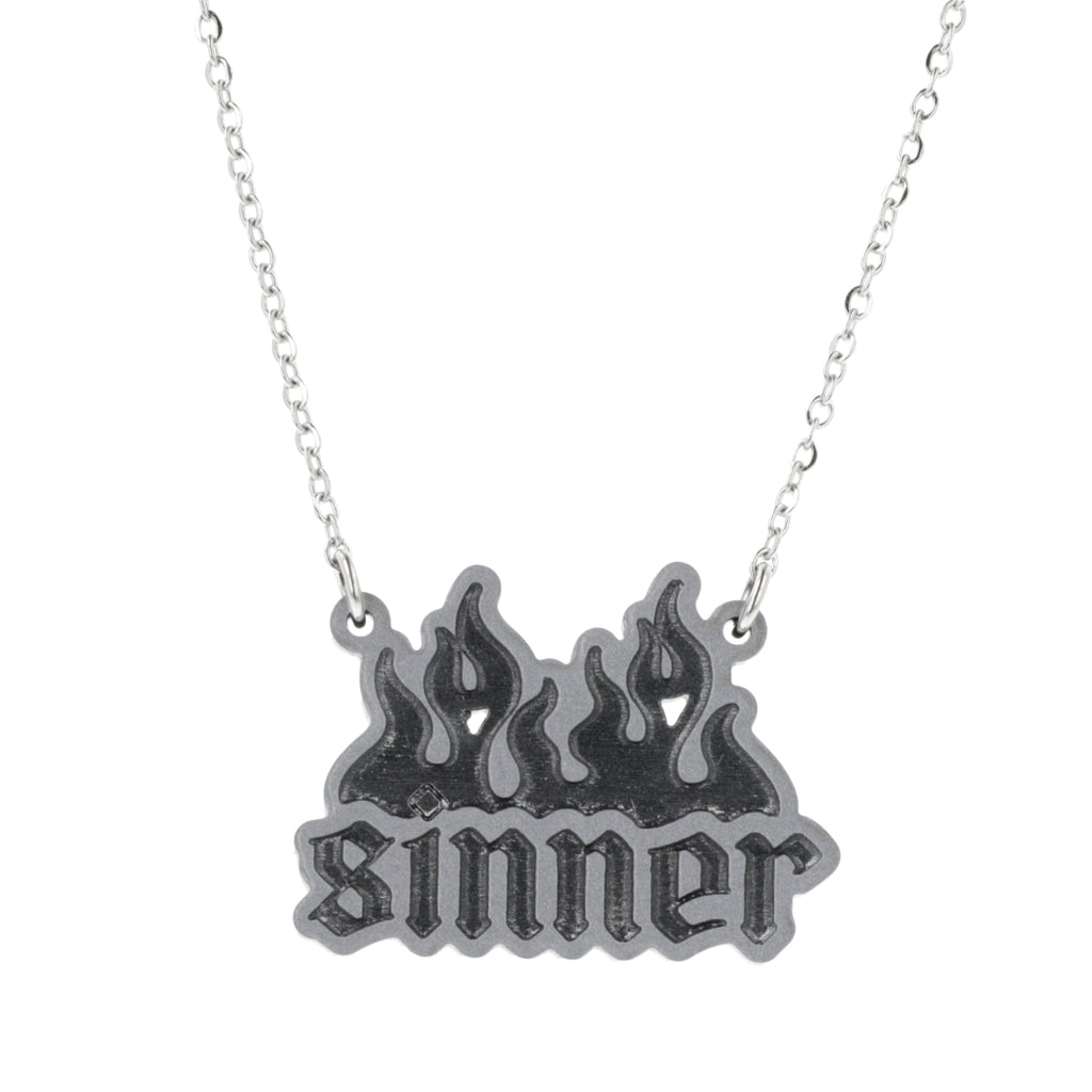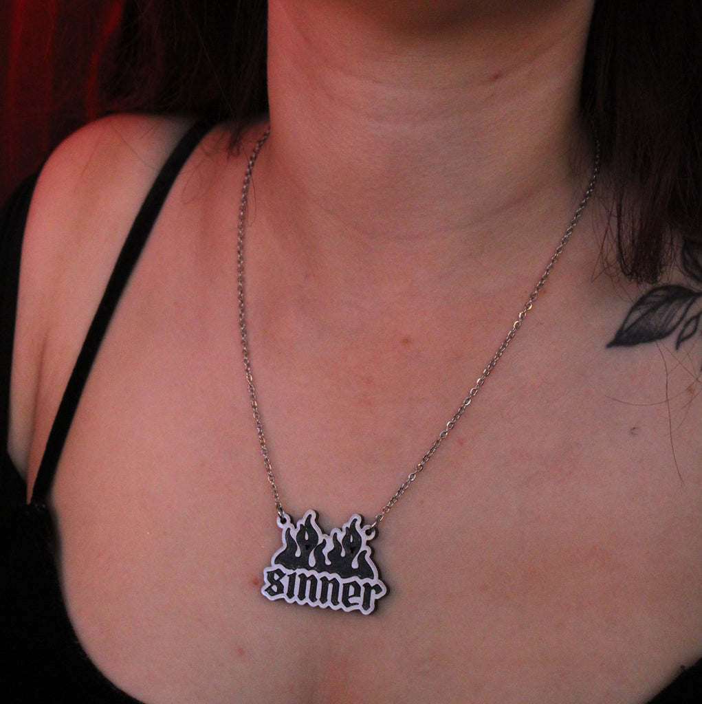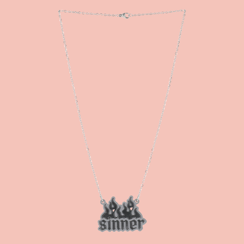 Add some fiery flair to your look with the Sinner Necklace. This acrylic pendant showcases the word “Sinner” in flaming gothic lettering, hanging from a sturdy stainless steel chain. It’s a playful way to embrace your bold side and stand out from the crowd.