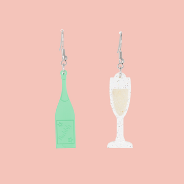 These 'Bolly' Champagne Bottle & Glass Earrings are not your average jewellery. The green frost champagne bottle, engraved with 'bubbly', and the holographic glitter flute hand-poured with resin make for a unique and eye-catching design. The 'Bolly' Champagne Bottle & Glass Earrings are made with stainless steel earwires, they are durable and long-lasting. Elevate any outfit with a touch of elegance and sparkle.