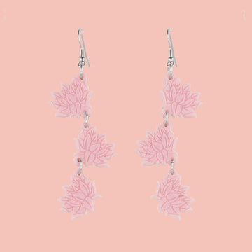 Enhance any outfit with our Cascading Pink Lotus Earrings. These elegant earrings feature handcrafted acrylic pink lotus flower charms dangling from stainless steel earwires. Perfect for any occasion, these earrings add a touch of natural beauty to your look.