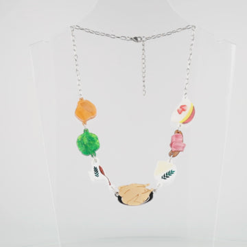 Convey your Christmas dinner with you in this dazzling necklace! Featuring an acrylic Yorkshire pudding, sprout, gravy-pouring jug, turkey plate, mashed potato bowl, pigs in blankets, and trifle charm, this unique necklace is handmade in Manchester with lots of love. Add a fun, festive flair with this show-stopping piece!