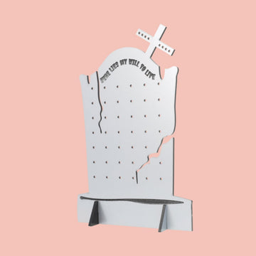 Add a touch of dark humor to your space with the Mini Will To Live Jewellery Stand. Shaped like a tiny gravestone, it offers a quirky and playful way to organise your earrings and necklaces. Perfect for those who enjoy a cheeky twist on the usual jewellery storage!