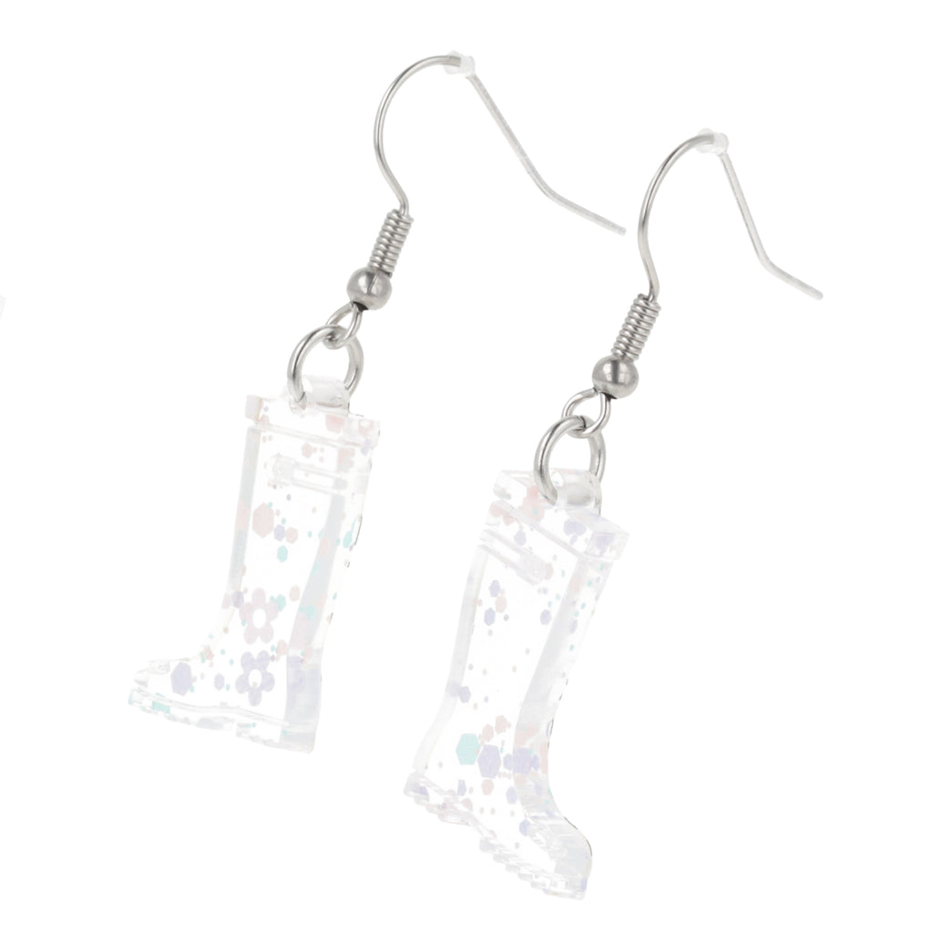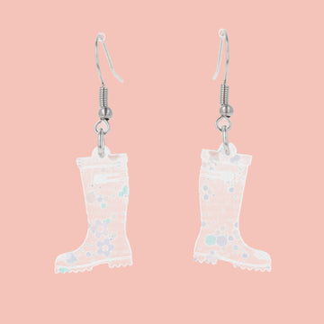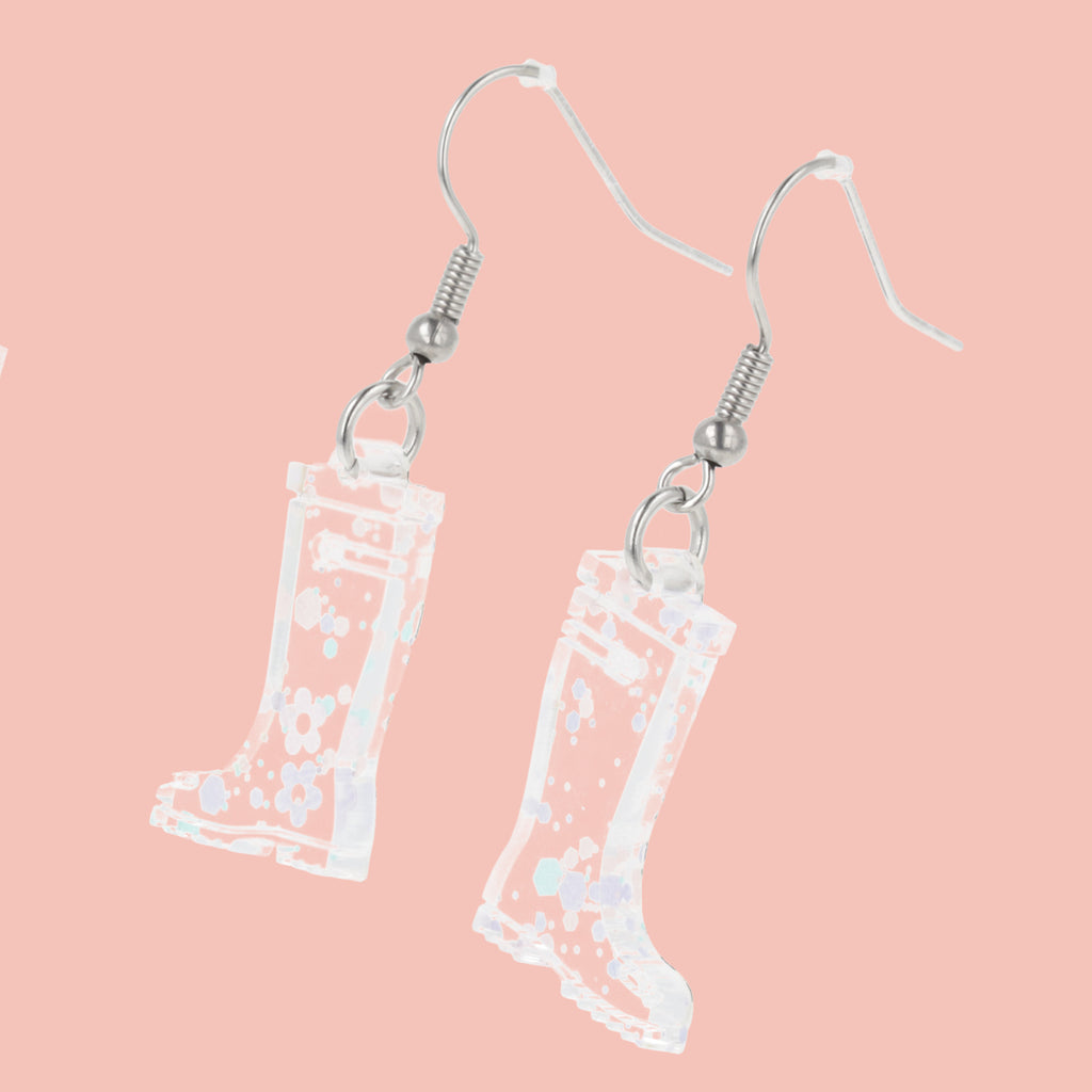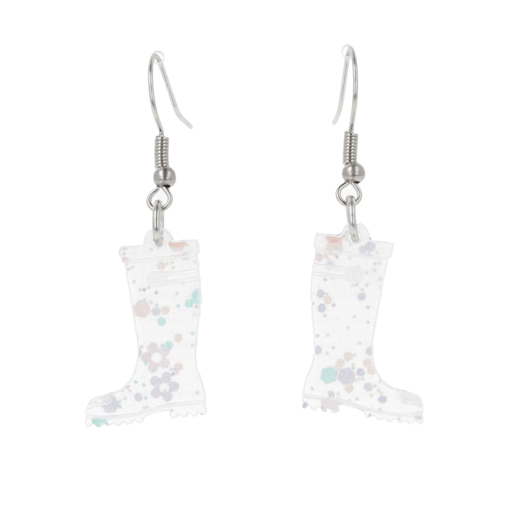 Splash into style with these quirky Confetti Wellies Earrings! Each pair features transparent acrylic wellington boot charms with pastel flowers and confetti on each boot, dangling from stainless steel earwires. Perfect for adding a touch of fun to any rainy day.