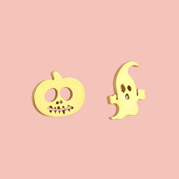 Scare up some style with these adorable Pumpkin and Ghost Stud Earrings! Crafted with gold plated stainless steel , you're sure to make a spooktacular statement.