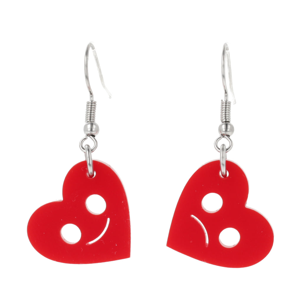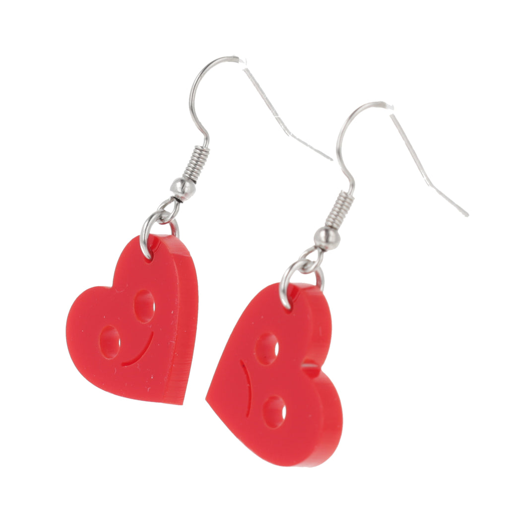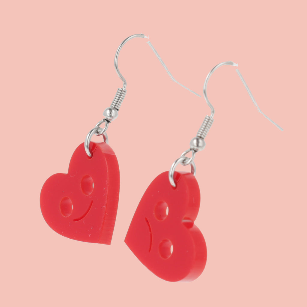 These Don't Go Breaking My Heart Earrings feature two red acrylic heart charms—one with a happy face and one with a sad face—for a playful way to wear all your emotions. Lightweight and quirky, they add charm and character to any outfit.
